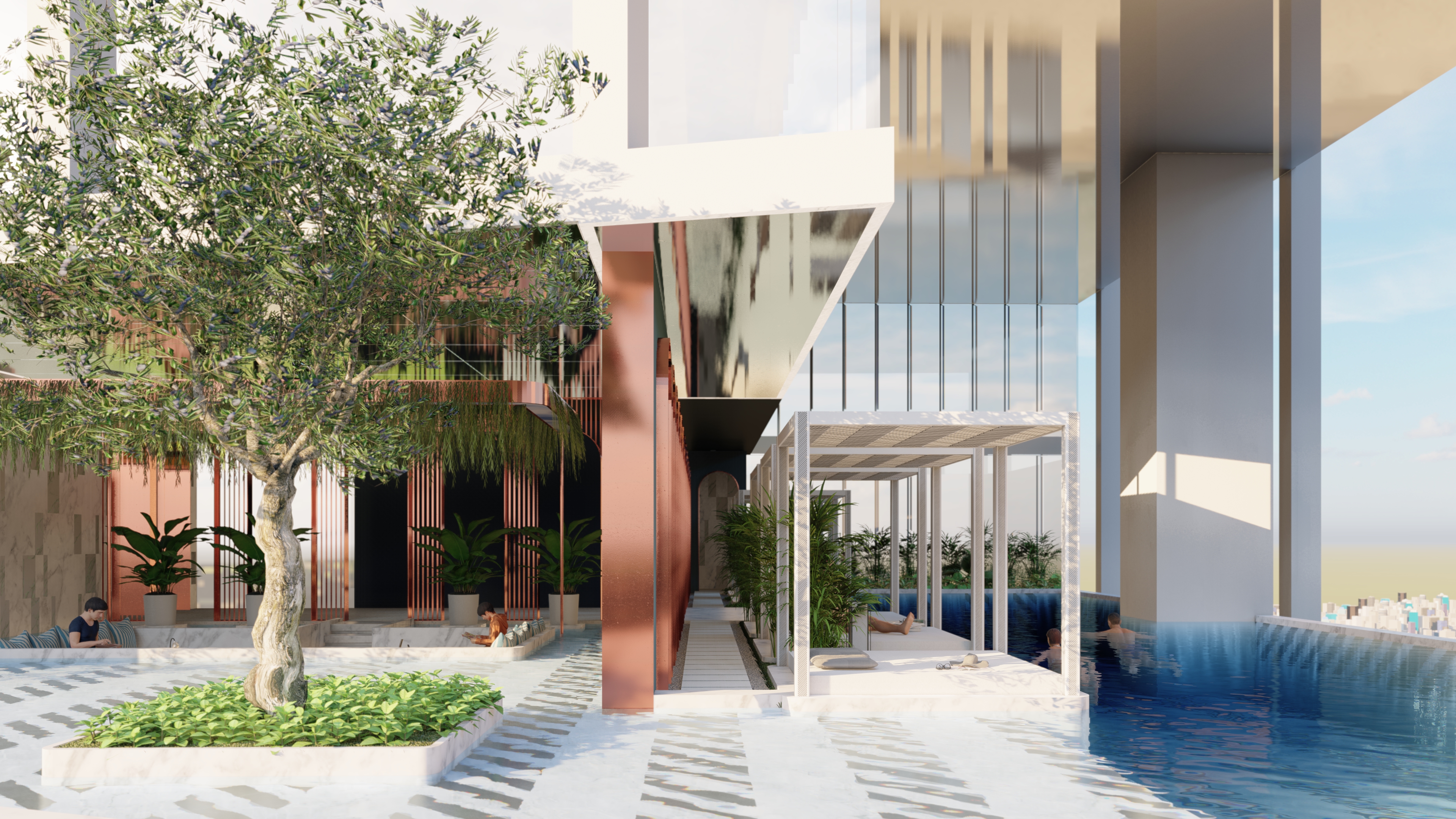 41 stories inclusive of Apart'hotel and office space with timeless design features such as a circular drop-off area at the entrance of building, gracious pedestrian space and lush landscaping.